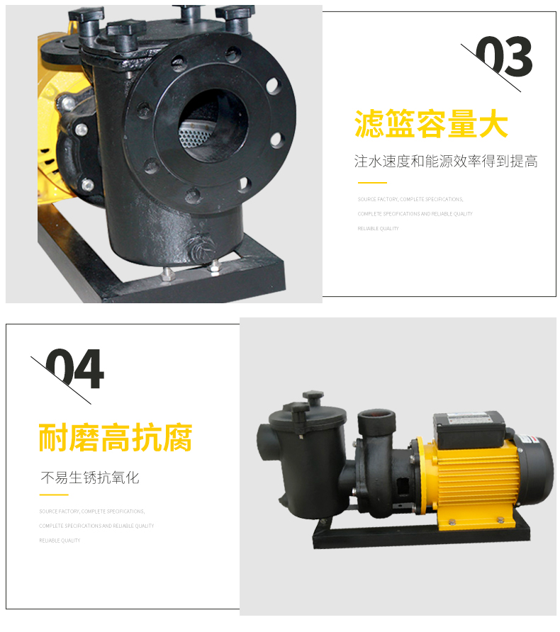 根據(jù)水力學(xué)原理設(shè)計(jì)的泵體,用金屬造成型,堅(jiān)固的一體式結(jié)構(gòu),經(jīng)久耐用。濾籃容量大,大大減少了清洗工作。性能好,效率高,加快了注水(灌溉)速度并提高了能源效率。適用于各種泳池、工業(yè)用水、海洋館、水上樂(lè)園等。