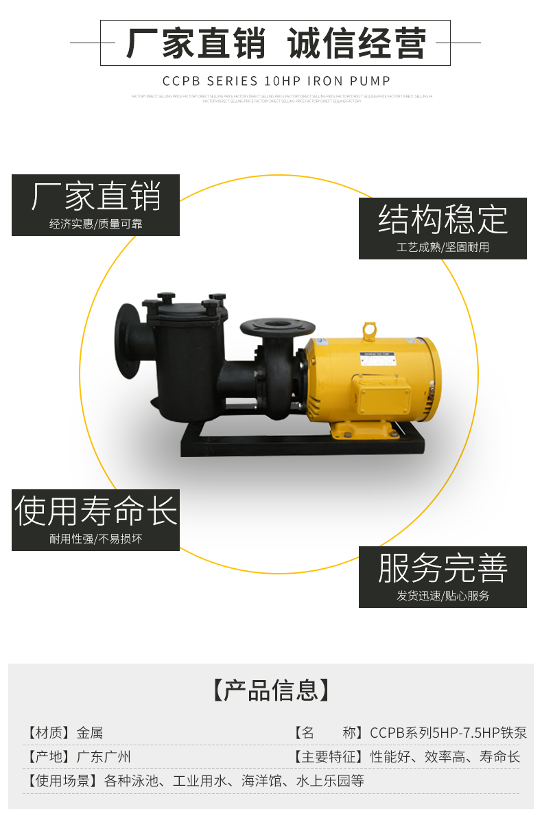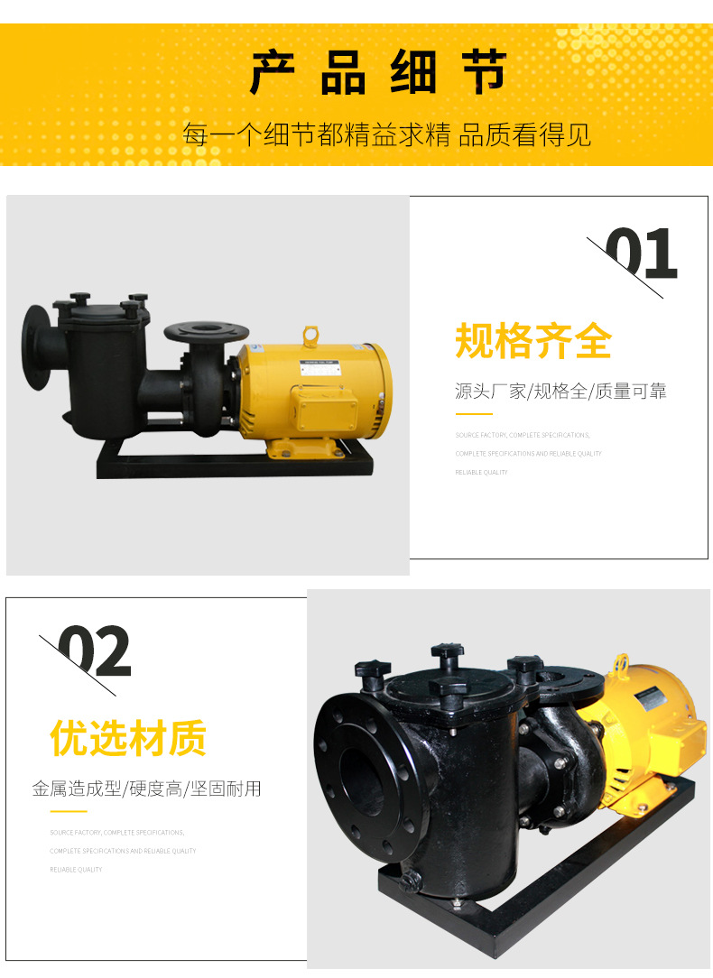- 根據(jù)水力學原理設計的泵體,用金屬造成型,堅固的一體式結(jié)構(gòu),經(jīng)久耐用。濾籃容量大,大大減少了清洗工作。性能好,效率高,加快了注水(灌溉)速度并提高了能源效率。適用于各種泳池、工業(yè)用水、海洋館、水上樂園等。