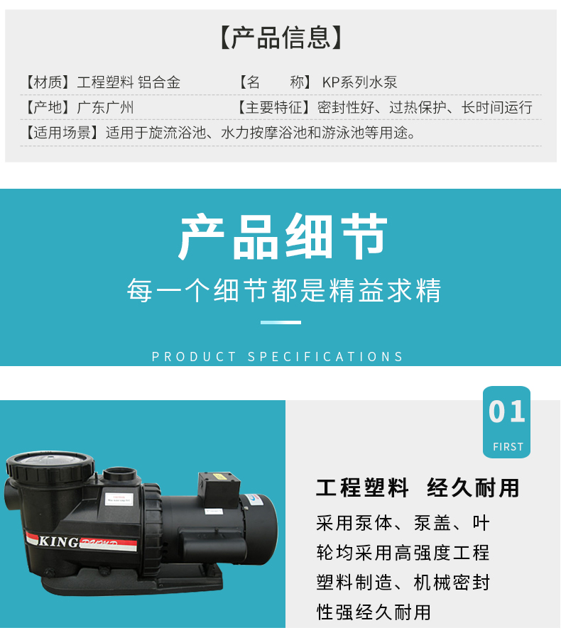 - 根據(jù)水力學(xué)原理設(shè)計的泵體,泵體、葉輪采用高強(qiáng)度工程塑料,經(jīng)久耐用。濾藍(lán)容量大,大大減少了清洗工作。性能好,效率高,加快了注水(灌溉)速度并提高了能源效率。適用于各種泳池、工業(yè)用水、海洋館、水上樂園等。