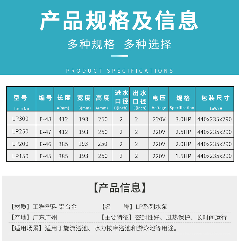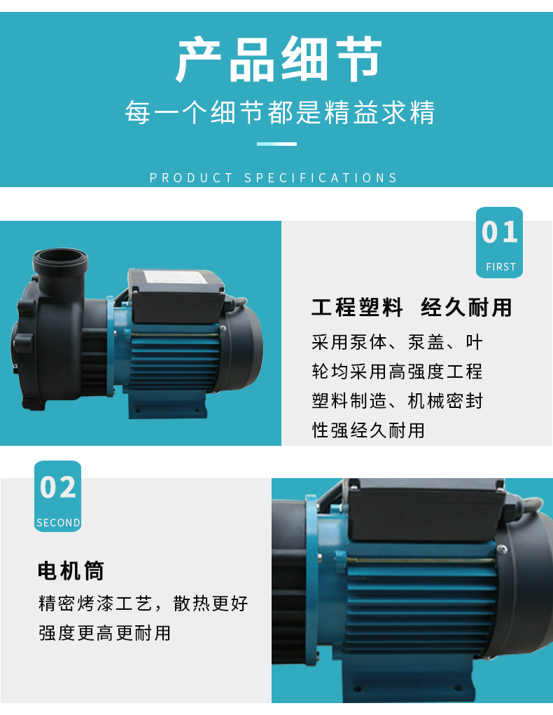 - 根據(jù)水力學(xué)原理設(shè)計的泵體,泵體、葉輪采用高強(qiáng)度工程塑料,經(jīng)久耐用。濾藍(lán)容量大,大大減少了清洗工作。性能好,效率高,加快了注水(灌溉)速度并提高了能源效率。適用于各種泳池、工業(yè)用水、海洋館、水上樂園等。
